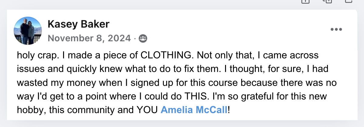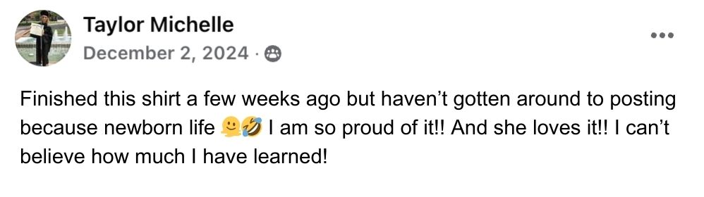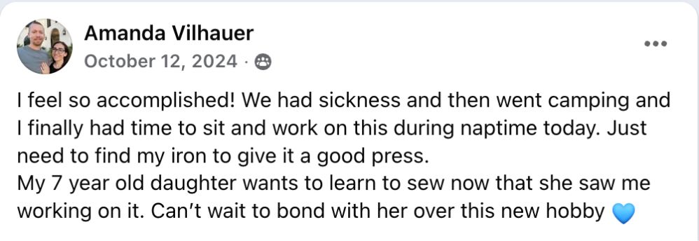 "Before this, I didn't have a hobby for myself. I have four kids, I homeschool, and life is busy. Sewing has become something that's just for me, but it's also productive. I can sneak in 10β15 minutes at a time and still feel like I accomplished something. It's given me joy, confidence, and an outlet that feels life-giving.